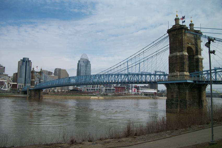 After parking and walking on day two, about 200 yards from the entrance to the magic kingdom of glass shards, I turned and snapped a picture of our Roebling Suspension Bridge of 1867. The longer and larger Brooklyn Bridge was modeled after our bridge and was built years later and designed by the same John A. Roebling our bridge is named for. Yes, little Cincinnati, Ohio was years ahead of fabled Brooklyn! I cross this bridge and park practically under it when I go to the site. |