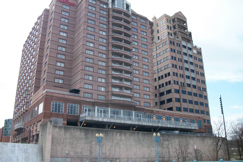 The high rise Marriott hotel sits approximately on the location of the factory building just above the flood wall and the woods.