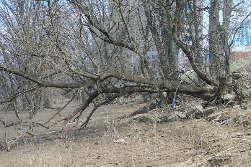 The narrow flood plane seemingly goes forever. The shards are in the tangle of brush, bricks, rocks, concrete, tree roots and debris on the rising bank. I'm well into the woods looking back towards the hotel. When the foliage is up in the spring and summer you would never know you're near civilization. |