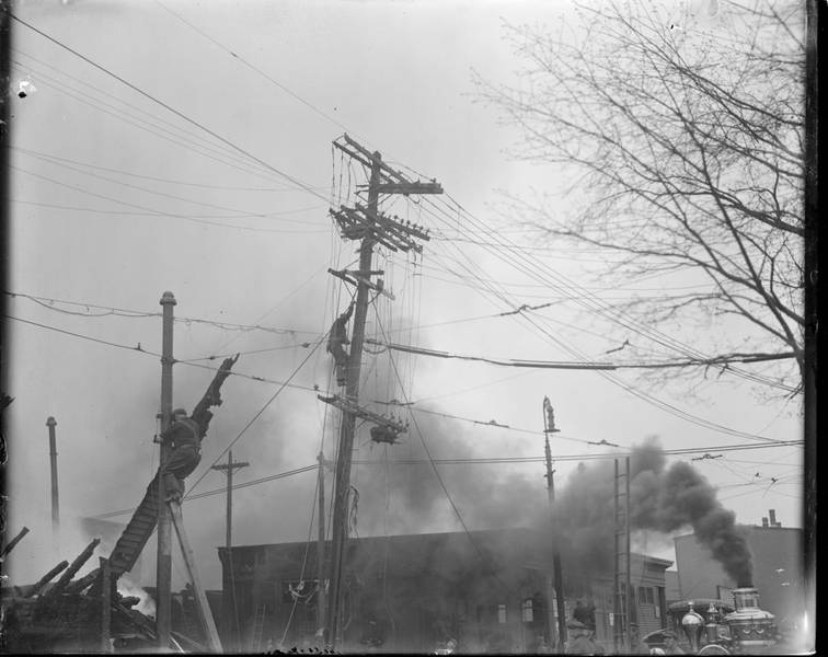 Most likely this was part of the Edison Electric Illuminating Company of Boston territory at the time. In 1938 the utility became the Boston Edison Company. I honestly don't think there was much this lone lineman could have done to save this rather shaky looking pole. Another lineman is seen on the left servicing a metal trolley pole. |