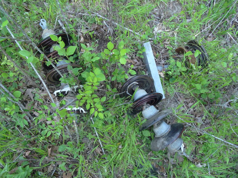 Summer 2018 I found these below a river crossing H-frame of a 44,000-volt Duke Energy line. I was hoping the multipart was undamaged but when I turned it over a big chunk was missing off the bottom skirt. The suspensions are the popular OB flanged cap type. |