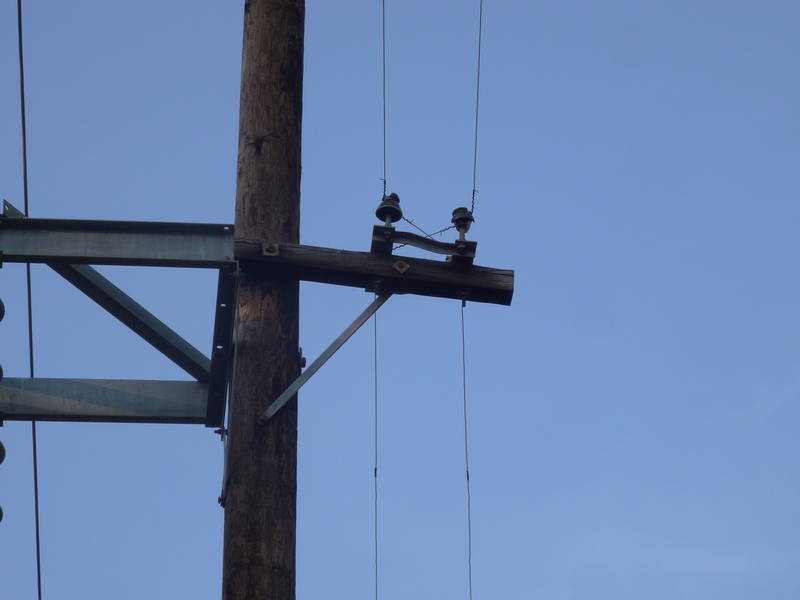Transposition bracket on a 44,000-volt line switching pole. Looks like OB straight-sided cable insulators.