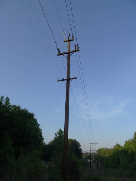 Typical Duke Energy 44,000-volt line but with a telephone line that was somehow reinstalled. There must have been a need for the telephone circuit only a mile or two from the power house. This is pole 6 from Ninety-Nine Islands hydroelectric plant.