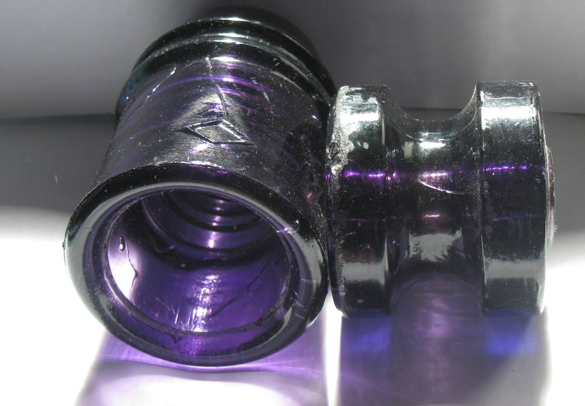 Here's a rarely seen or offered CD 1050 in true Royal Purple! Photo shows it beside a CD 121 Royal Purple Diamond insulator. The spool has thicker glass than the CD 121 but the sunlight shining through shows the spool actually has a richer Royal purple tint to it than the CD 121! Has factory grind marks on both upper and lower outer rims. Pinholes are factory mint. Has tiny ping and two tiny tic marks. First email gets this colorful spool for only $120 plus 8.25 shipping. Thanks Clete! |