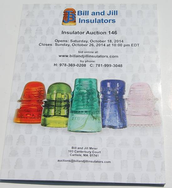 Bill and Jill Auction catalog # 146 October 2014 with prices realized 107 Pages. A insulator auction catalog that has 107 Pages of outstanding color photographs with excellent descriptions It is an excellent resource for the insulator collector. Comes with the prices realized and it is loaded with insulator historical information. Like new Condition $12.00... Plus postage. Will ship media Mail with tracking. |