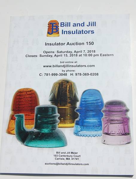 Bill and Jill Auction catalog # 150 April 2018 with 121 Pages with prices realized. A insulator auction catalog that has 121 Pages of outstanding color photographs with excellent descriptions ( in this auction a baby tea pot reportedly sold for $30,250 !!! ) it is an excellent resource for the insulator collector. Comes with the prices realized. It is loaded with insulator historical information. Like new Condition $12.00... Plus postage. Will ship media Mail with tracking. |
