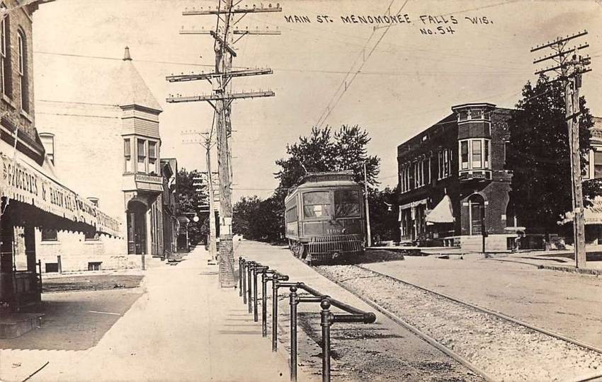 Menomonee Falls, WI, c.1910. Busy Telephone Openwire Pole Lines, Wires, Trolley.