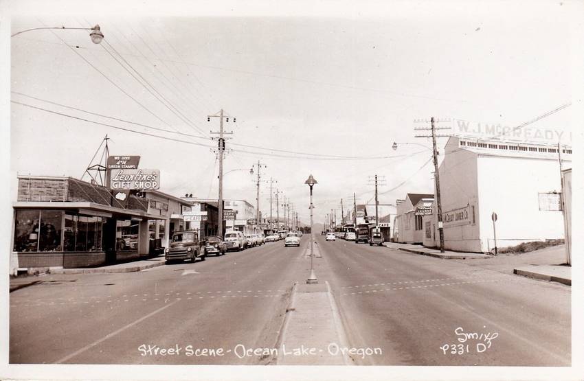 Ocean Lake, OR c1954 Downtown. Utility Openwire Lines, Old Cars, Acorn Street Lights