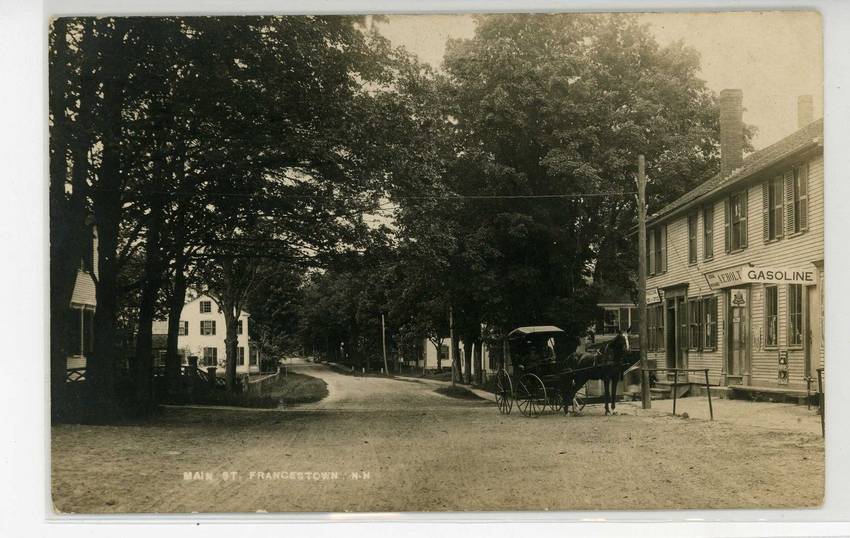Francestown, NH c.1915. Sidepin Pole in Front of General Store with Bell Sign.