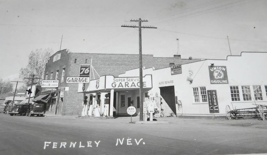 Fernley, NV c1940. Old Cars, Phone Openwire Pole with 6-over-16 Pin Crossarm