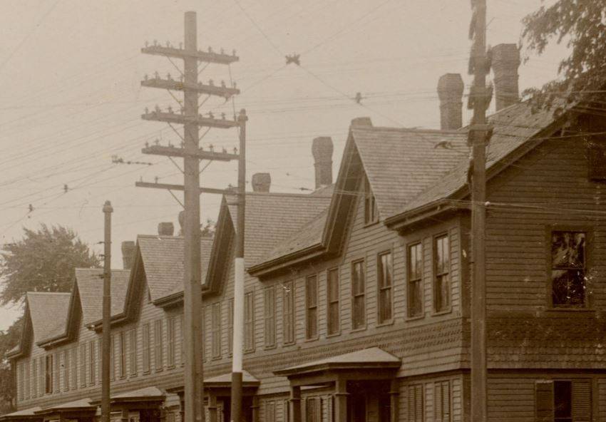 Boston, MA Vicinity, c1900. Pair of Square Utility Poles Making Turn Around Corner