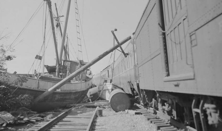 CT Coastline, 1938 Hurricane. Electric Transmission Pole Knocked Against Train.