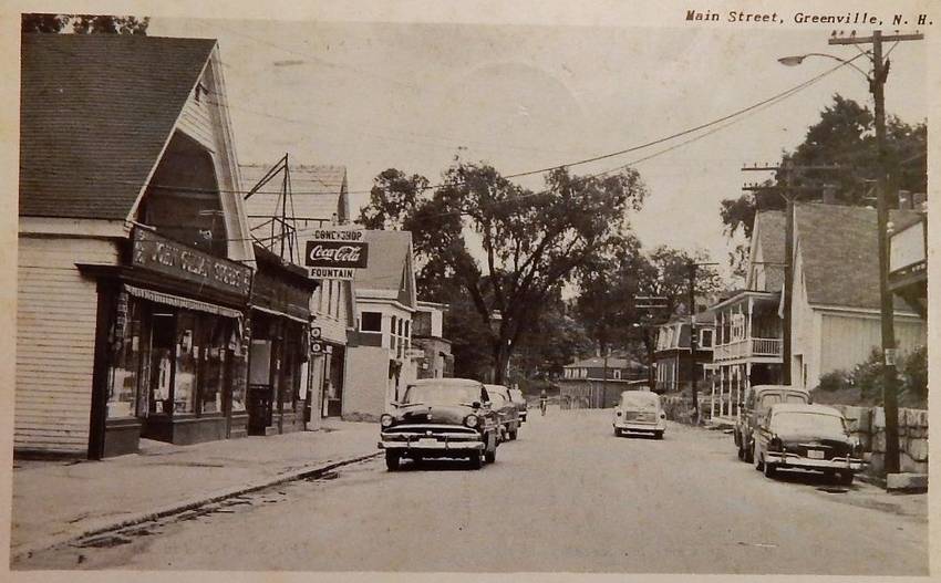 Greenville, NH c.1955. Town Center with Electric Distribution Lines, Old Cars, Stores.
