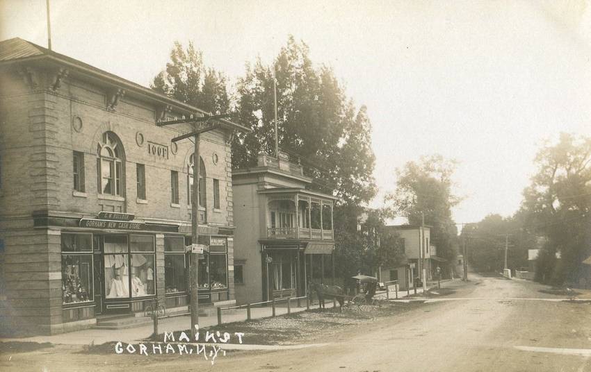 Gorham, NY c.1905. Village Center with Two Piece Tramps Atop Telephone Pole.