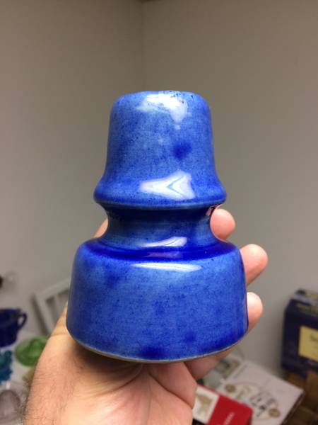 Here's a nice blue U-180 Ohio Brass stovepipe you don't see for sale too often. It has a pinky nail chip on the inner skirt and a small match head chip on the edge of the base. Check out second photo for damage. $125 plus $10 for shipping