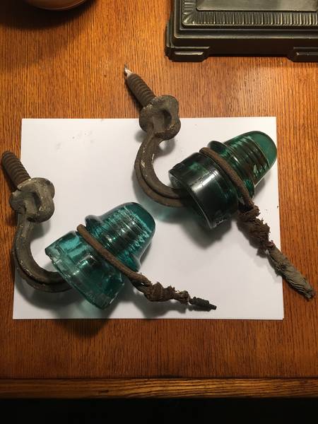 These came out of an old building in Denver ages ago. Insulators are original to the brackets. One is a 134 KCGW (clean chip on skirt) in a greenish aqua and old cloth covered wiring attached. Next is a 162 R Good (dot on back) in blue aqua (couple flakes here and there). Each bracket is somewhat rusty but also too each has some old tarp like covering on the threads. They are cool! PP fine but use the gift option please. $40 each and that includes postage. Buy the pair and $70 total with postage. US Addresses. Thanks! |