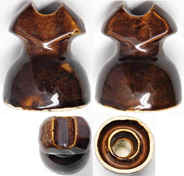 Here is very crude, apparently hand-carved, wet-process, cable top U-540 porcelain insulator in an uneven, mottled brown glaze. Besides a couple of scuffs on the outside of one ear, the rest is undamaged. Less common than its white cousin, add this beauty to your shelf for just $10 plus postage. |
