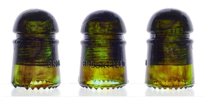 They don't get much better than this! Absolutely beautiful CD 102 Brookfield pony with the large sized sharp drip points. The base color on this pony is aqua, but it is so full of heavy swirls that piece looks mostly amber from a distance. When viewed more closely, patches of aqua are noticeable in the skirt, with a mix of deep green and amber throughout the rest of the piece. It truly looks amazing from every angle! Great condition overall, with five damaged drips. The area to the left of the embossing with two missing drips is actually not damage, but rather a defect in which the glass didn't fill in during the molding process. There is one tiny flake at the base edge at this spot. A 'top shelf' item amongst Brookfield ponies, and no upgrade needed with this one! $185 plus shipping. |
