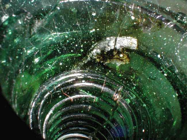 I bought this Brookie piece at the 2002 fall Ohio show, this piece has a very large 3/4" X 3/8" tapered tadpole shaped chunk of silver metal in the inner skirt, this piece of metal has also spawned a lot of amber swirls as well making this insulator a dark green color instead of aqua. What a wonder to see underlit. |