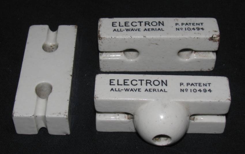 Here's a rare 3 piece set of British porcelain "ELECTRON ALL-WAVE AERIAL P. PATENT No 10494" radio strains made by New London Electron Works, Ltd in East Ham, England. Company was founded in 1902. Became a private company in 1916. So these patented radio strains are quite early. Each one has identical marking. Measure 3" long x 1.25" wide. They are in excellent condition with only a small chip on each insulator and some minor roughness on the corners. First email gets this rare set of porcelain radio strains for only $275 plus 8.00 shipping. Can accept payment over 2 months. Never seen any like these before now. Thanks! |