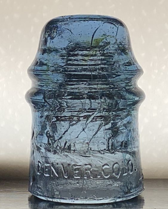 A stellar example of the lack of quality control at WFG Co. CD 121 Near Cornflower Blue with slight lavender tint also with a Yellow-olive streak above and around a portion of the pinhole. One small pot stone (a little larger than a pinhead) has a 2/3 pinkie nail halo just under the surface. Crude threads and surface annealing lines, typical of Denver glass. As for issues since leaving the factory, still a nice insulator and would make a nice addition to your Denver glass collection. Asking $200 plus shipping. |