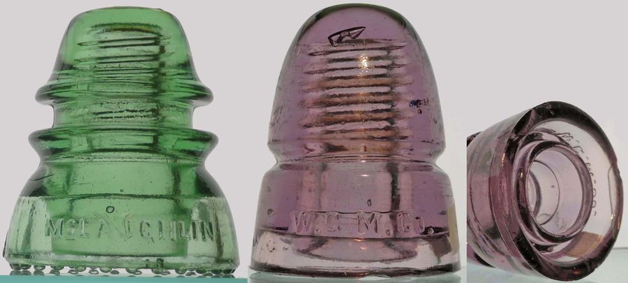 insulators as follows - actual postage additional CD 154 McLAUGHLIN // No 42 (backwards 2) -- RDP -- great bright green -- VNM -- $8 CD 145 W.G.M.CO. in light purple -- two flat base chips plus a base bruise (see photo) - $35 plus actual postage Or take the pair for $40 NOTE: I'm selling these insulators on behalf of the Jim Fielding estate -- PayPal (no fee friends and family) or checks are both accepted - I'll provide instructions. I'll also be handling all the packing and mailing. |