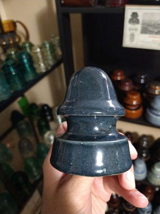 Not to leave the porcelain signal hounds feeling left out, I am deciding to offer this exceptionally tough no name G.P. Co signal. I'd say this is on the dark side of midnight blue with tons of character in the right light. The insulator has a very neat manufacturing crack/defect in the dome that is about 1 1/2" long near top and a glob of burnt bubbly glaze smack dab in the middle of the annealing fracture. There is one fleabite on each wire ridge and two very shallow base flakes which may also be day one due to the exceptional smoothness of the glaze around them. I am asking $80 plus shipping. Am happy to send more photos and combine shipping where safe to do so. PayPal friends preferred or check from ICON members. I'll thrown in a 3 1/2" mottled brown G.P. Co. strain with the purchase of this signal for no extra cost. Thanks for looking! |