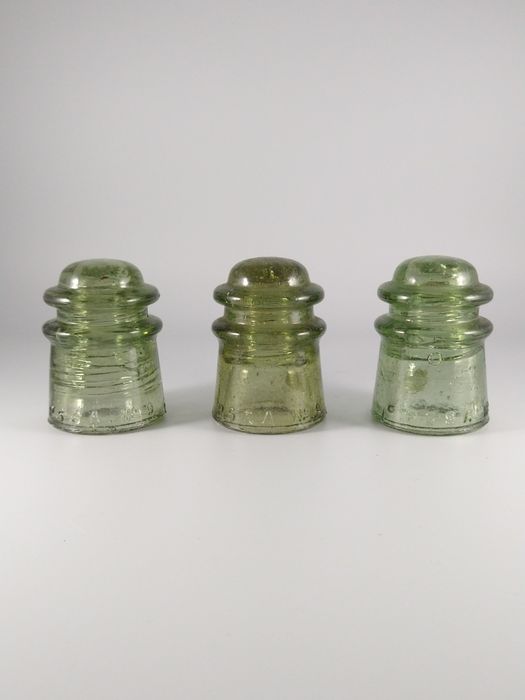 Here is a very bright Mexican pony that rarely turns up in this color. This listing is for the insulator in the center only (but you might twist my arm to sell the other two). I hope the photo conveys this is not your typical green but I would say is definitely on the spectrum between yellow green-citrine, leaning more citrine. The color really glows and pops in hand, not nearly as much as it does with the compadres on either side. The insulator is loaded with seed bubbles and has some nice carbon in the dome. It displays dead mint from the front and would look superb backlit. The only damage I see are two shallow base chips on the rear skirt (right next to one another). One chip measures 1/2" long and the other one 7/8". Factoring in the color and damage let's try for $180 including shipping/insurance to your door in the US. PayPal friends preferred or checks from ICON members. Thanks for looking! |