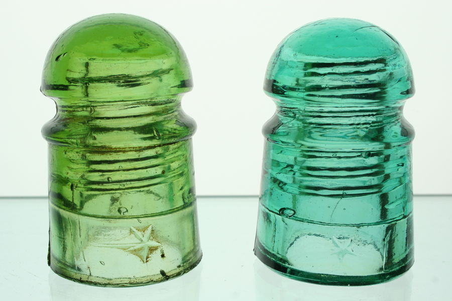 The yellow green has a streak attached to the star just like a shooting star would appear. There is a star on each side of the insulator and they both have a tail. The only damage is a couple of flea bites and a tiny open bubble. $45 plus shipping. There is no damage on the green aqua (star on only one side) $15 plus shipping. Take the pair fo $50 plus shipping. |