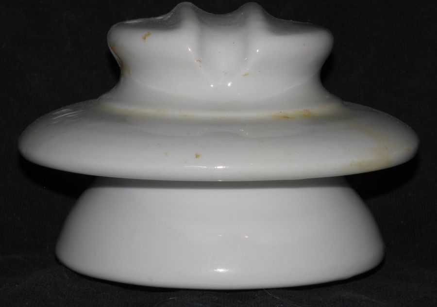 Here's an unlisted unipart porcelain insulator made by unknown manufacturer (marked H u M) inside a sideways diamond) and 1929 possibly exported to Spain. Marking looks similar to AH in a diamond by Adolfo Hielscher in Germany. Measures 4" base width x 3" tall. Has fingernail chip and a pair of circular cracks on reverse upper wire groove. Base and both skirts are VNM+. Some stains. First email gets this early unlisted porcelain insulator for only $25 plus shipping. Thanks |