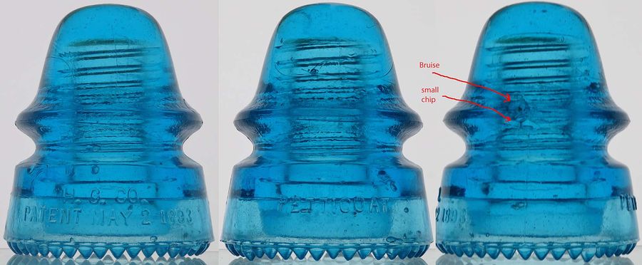 CD 162 H.G.Co. / PATENT MAY 2 1893 // PETTICOAT -- SDP -- beautiful dark electric blue with some decent dome glass -- only damage is a bruise on the side with a small associated chip (see right side of the photo) - rest of the insulator is fantastic including the drips! $340 plus actual postage NOTE: I'm selling these insulators on behalf of the Jim Fielding estate -- PayPal (no fee friends and family) or checks are both accepted - I'll provide instructions. I'll also be handling all the packing and mailing. |