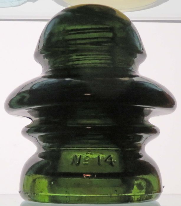 CD 202 No. 14 / "blot outs" // "blot outs" -- great dark olive green with some amber! only issues are on the inner skirt with two small chips and some flaking - fantastic for these!!! $275 plus actual postage NOTE: I'm selling these insulators on behalf of the Jim Fielding estate -- PayPal (no fee friends and family) or checks are both accepted - I'll provide instructions. I'll also be handling all the packing and mailing. |