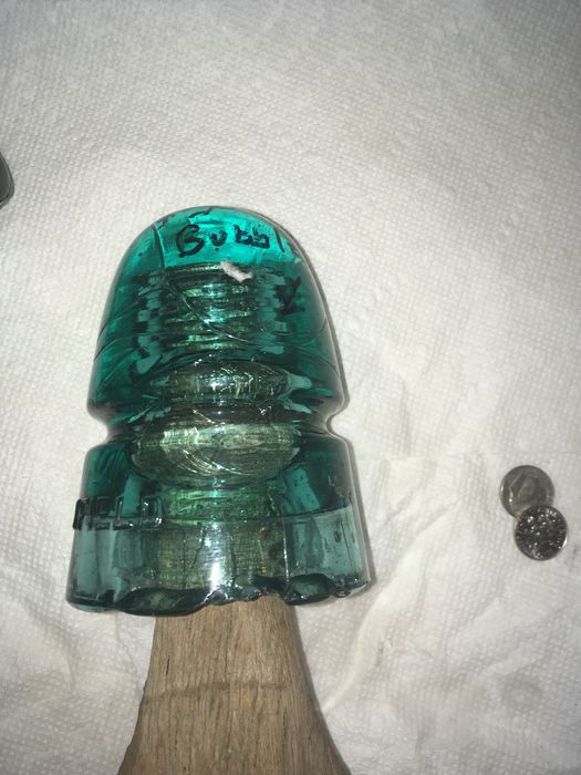 CD 145 Brookfield Glass Insulator w. 2" x 1" huge bubble . You can put 3 quarters and three dimes inside the bubble and still screw on a wood pin. Very crude offset pin hole and inner skirt. Chipping on base as pictured. A one of a kind piece. Friends and family to this email. thanks