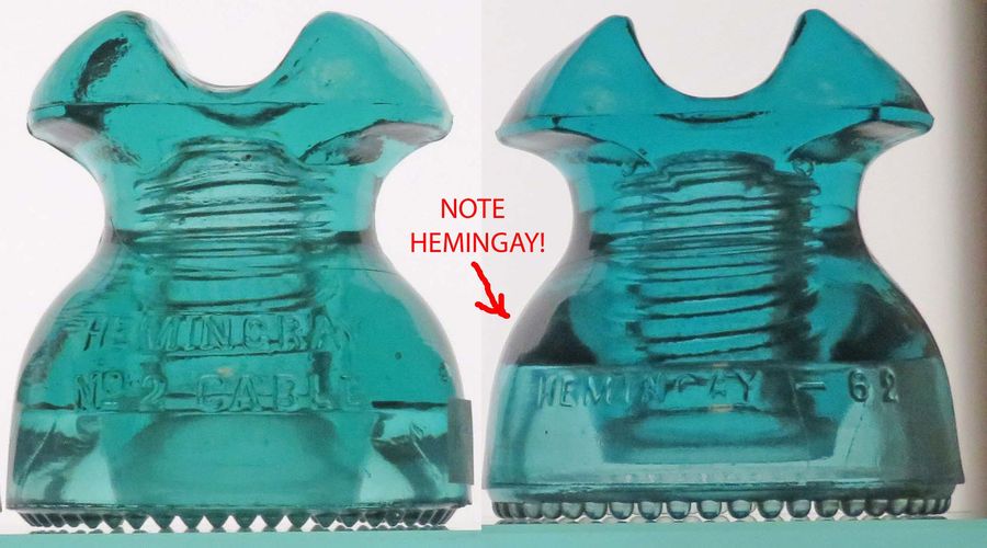 Insulators as follows -- actual postage additional: CD 252 HEMINGRAY / No 2 CABLE // PAT MAY 2nd 1893 -- SDP -- no issues -- $10 CD 252 HEMINGAY-62 // MADE IN U.S.A. (NOTE HEMINGAY error!)-- RDP -- no issues -- $20 NOTE: I'm selling these insulators on behalf of the Jim Fielding estate -- PayPal (no fee friends and family) or checks are both accepted - I'll provide instructions. I'll also be handling all the packing and mailing. |