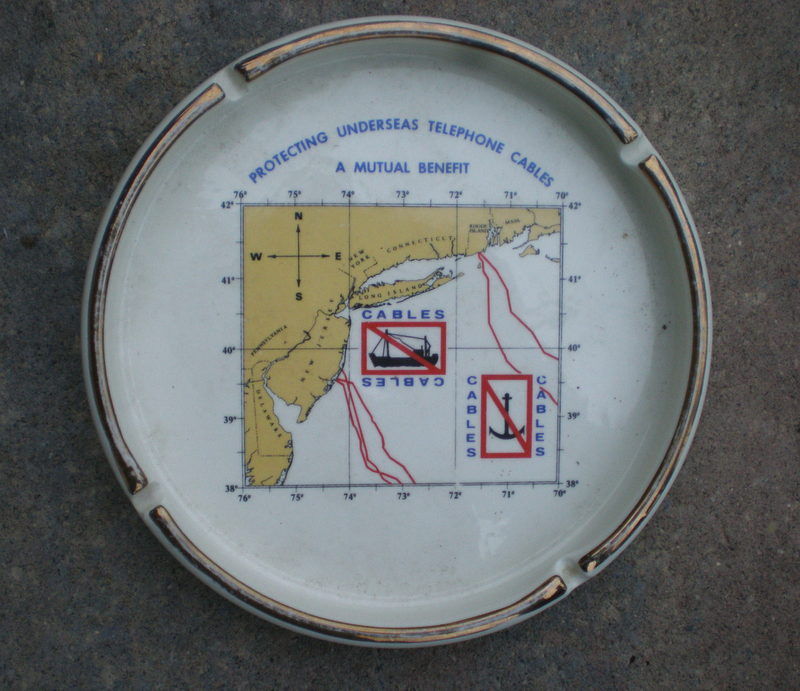 PROTECTING UNDERSEAS TELEPHONE CABLES A MUTUAL BENEFIT. This 6.5" diameter ash tray shows a portion of the east coast in colorful yellow with a lot of detail. Interesting go with and one that I have never seen. Very good condition. Asking just $20.00 and that will include shipping to your US address. PayPal, friend mode, or check |
