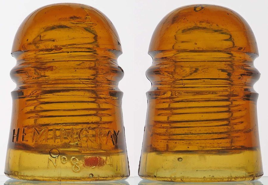 Here is one of the top insulators in the hobby for desirability -- Not many exist and the color is spectacular. CD 112.4 HEMINGRAY / No 8 -- fantastic golden amber. I had previously listed this insulator but discovered there are two small areas of repair on the wire ridge. It turns out this insulator previously sold in a 2007 insulator catalog sale by Mike Green [id=609259594]. The repair was so well done that I did not detect it visually holding the insulator and even with a magnifying glass - there is a hint of it in the photo that is hard to see with the naked eye. The repair was done to some light nibbling on the top wire groove and a tiny peck on the second groove allowing the insulator to display as VNM+ with just a tiny peck on the middle groove remaining. Asking price is $5450 plus actual postage. NOTE: I'm selling these insulators on behalf of the Jim Fielding estate -- PayPal (no fee friends and family) or checks are both accepted - I'll provide instructions. I'll also be handling all the packing and mailing. |