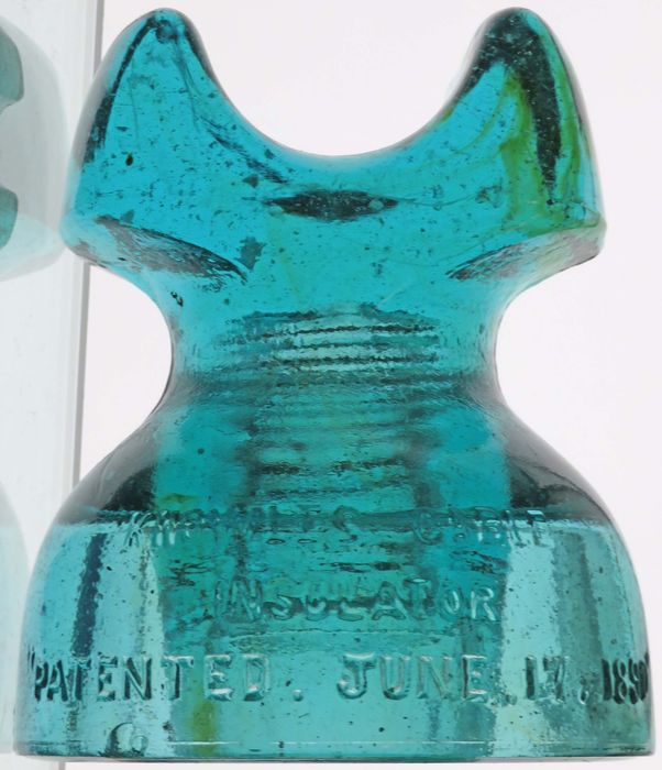 CD 253 KNOWLES / CABLE INSULATOR // "PATENTED JUNE, 17 1890" -- aqua with nice snow -- also a great amber swirl in the ear! Nice condition with a short annealing line on the inner skirt and a few tiny pings -- $70 plus actual postage. NOTE: I'm selling these insulators on behalf of the Jim Fielding estate -- PayPal (no fee friends and family) or checks are both accepted - I'll provide instructions. I'll also be handling all the packing and mailing. |
