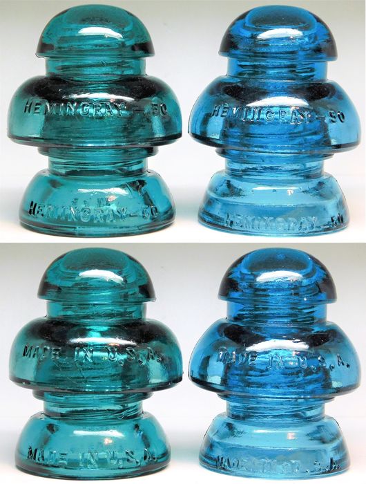 On the left is EIN [030] {191 Top} (F‑Skirt) HEMINGRAY‑50 (R‑Skirt) MADE IN U.S.A. {190 Bottom} (F‑Skirt) HEMINGRAY‑50 (R‑Skirt) MADE IN U.S.A. SB in Aqua. No damage. Asking $20 plus postage. On the right is a marriage between a top EIN [030] {191 Top} (F‑Skirt) HEMINGRAY‑50 (R‑Skirt) MADE IN U.S.A. and a bottom EIN [070] {190 Bottom} (F‑Skirt) HEMINGRAY‑50 (R‑Skirt) MADE IN U.S.A./['No 50' blotted out] SB. Color is Hemingray Blue with the bottom slightly lighter than the top. Top has roughness around the pinhole, and the bottom has a tiny flake off the upper wire ridge. Asking $30 plus postage. Each set comes with a wooden cob to hold the pieces together. Take them both for $55 shipped in the US. |
