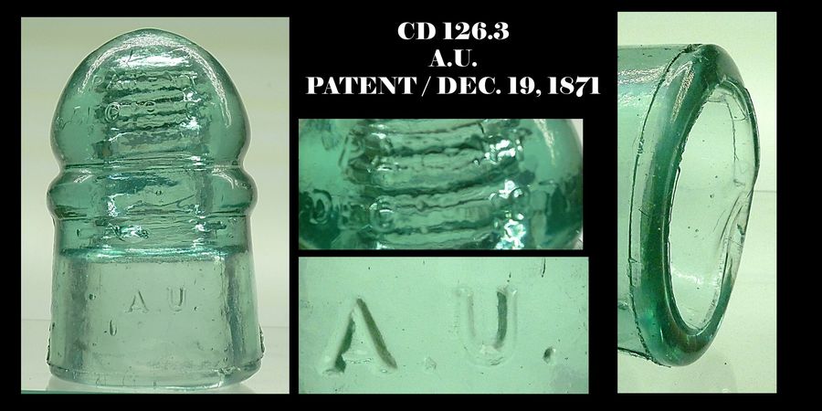 CD 126.3 A.U. telegraph insulator. Front crownl: PATENT / DEC. 19, 1871 Front skirt: A.U. Smooth base. Base has a deformation from factory maybe from slightly slumping. (see photo) Light greenish aqua As close to mint as they come. Light wire rubs in wire groove are all I see as wear. Click the "View Original" to get a better view. $100.00 + shipping Stock #a2101 |
