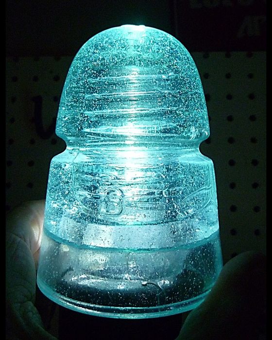 CD 145 B telegraph insulator Front skirt: B Crown top: a backward " 12. " Smooth base Light aqua. Massive amount of fizzy bubbles. Small bruise right side of crown. Up high. No glass missing. Small bruise on right side upper wire rim. Tiny flake on inner skirt. WHAT A BEAUTY !!!! $25.00 + SHIPPING Stock #a2106 |