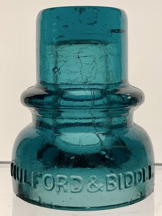 Okay, here's the grand poobah of my offerings today. Rarely found in this condition is a VNM Blue MULFORD & BIDDLE threadless hat! Color discussion first. All these blues are thrown into the general category of "cobalt blue." There are cobalt and ink blue Mulfords, but this is a much rarer color that I want to call teal blue or midnight blue, but it's a chameleon. I have included photos from my 5000K light box with a 92 CRI that makes it look more teal blue, and I've included a photo in natural light which makes it look even more blue. Whatever color you call it, this is a genuinely rare insulator. Condition is incredible for such an old timer. I see a flea bite on the edge of the dome in front and a flea bite above the embossing in front, a couple tiny flakes on the rear wire ridge, a flat 3/4" flake on the base and nibbling around the base edge, mostly on the rear. There's a lengthy thin string of milky amber that snakes it's way horizontally from above the thread cavity into the skirt above the embossing where it terminates laterally. There's several nice bubbles as well. Look at how this displays from the front! This insulator also comes with a note that it was dug in the early 1970's in Wyoming, along the old UPRR. What a great historical artifact from when railroads just first began to span our continent! Far more rare than the richer blues, if you're into railroad history or just building a color lineup of threadless hats in your insulator collection, don't pass up the opportunity to purchase this piece. Could be a looong time before one like it is offered again, and you will likely have to pay a buyer's premium as well. I'm offering this today at $2,750 shipped. More photos to come. |