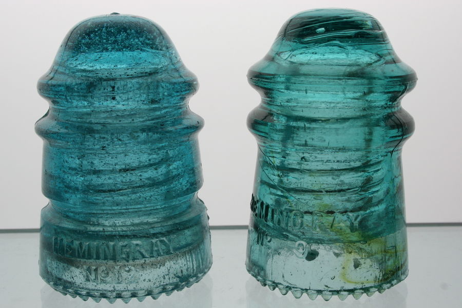 HEMINGRAYS Very Fizzy BLUE No 12 $60 and AMBER skirt No 9 $35 LEFT: Very Fizzy Blue Hemingray 12 emboss error I2 PATENT 1893 There is a very fizzy insulator. It also has the error prismatic embossing. It reads "HEMINGRAY" / "I2" (instead of 12). Damage consists of two base bruises. The one is very light and hard to see (below "RAY"), as the fizz seems to hide it. The second base bruise is the area of the dark spot. It looks like dirt got in behind the bruise. There are 5 damaged drips from sliced in half to completely gone. There is a wire rub to the upper groove and a tiny nick to the same groove wire ridge. RIGHT Nice Amber and small junk Hemingray 9 PATENT 1893 This insulator has a lot of character. There is just enough amber to make it interesting. There is also some fizz and white junk right behind HEMINGRAY. I think there are some small stones, but it could be just some specs of milk. Prices in title do not include shipping. I use regional rate boxes and padded envelopes which lowers shipping cost. |