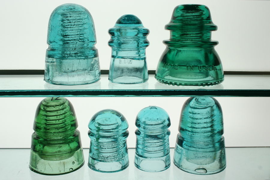 7 Very Near Mint Assorted CD Insulators $45 shipped in the USA (backs) The only damage I could find was a surface annealing crack on the top left insulator. Both Brookfield beehives have the double patent dates 1883 and 1884. See the first photo for the other sides and a slightly different exposure. Note the Hemingray-42 is a good green aqua and not the true green. I would sell any one insulator for $10 plus shipping. |