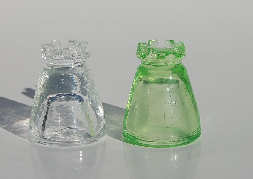 SI 206-1.000 No Name Special Issue Miniature Castle Set of Two Free Shipping ( F-Skirt) 'W' With Wings (Produced by Fred Wilkerson) These Glass Miniatures are appox 1" high and 3/4 " wide. The colors are from left to right, Clear, Vaseline Green. All are in MINT condition and listed in the Price guide!! The photograph is part of the description. Picture taken outdoors. Buy with confidence! .Payment may be made by Pay- Pal or other forms. Both Pieces for $ $25.00 and I pay the USPS Priority Mail postage to U.S. addresses only. Don't wait for a sale it's not going to happen. |