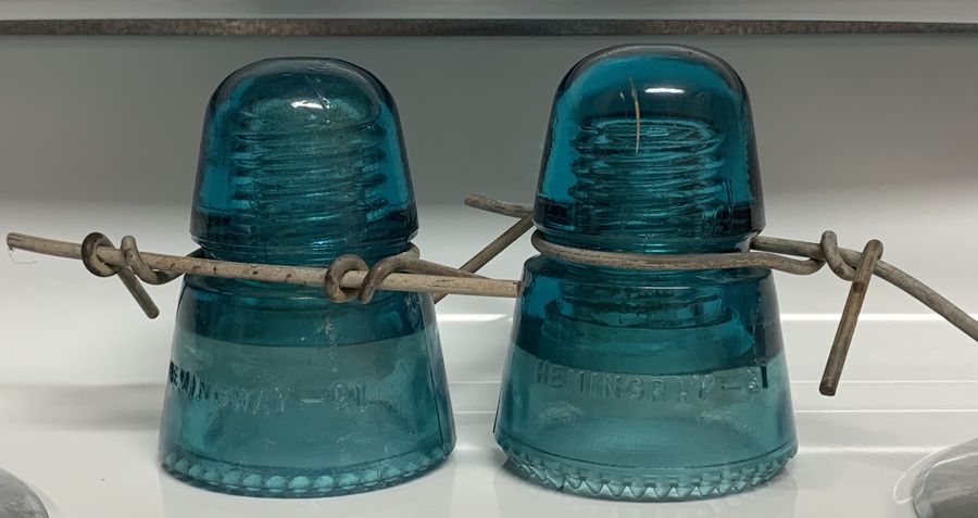 A nice pair of Hemingray Blue CD 145 Hemingray - 21 Beehive Insulators with wire ties I left the pair as removed from the poles and have not been cleaned up. The insulators are: EIN [080] SDP - VNM all drip points 100% intact. EIN [070] RDP - VNM with all drips intact. It has round indentation on top of the dome. These were still in the air until October 31, 2020, when a portion of the former ATSF (now BNSF) signal line was removed between Springer, NM and Levy, NM. I'm asking $25 shipped for the pair. |