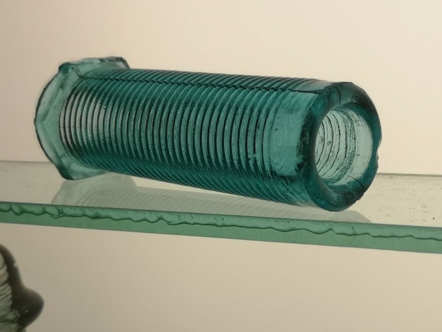 Heavyweight piece of glass 6 inch length and a 1 inch bore nice blue aqua and a couple neat bubbles, one pinky nail size chip on end opposite the hex, hex side has edge roughness threads are in phenomenal condition. $150.00 US plus shipping, will combine shipping with my other listings. PayPal or Canadian e-transfer, Please inquire about PayPal address. |