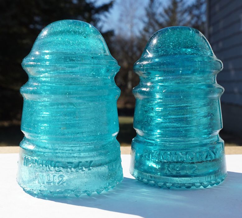 Both are the 130 EIN. The light blue also has some light milk in with fizz. 2 or 3 partially nicked drips and a short annealing Y-crack up from the base to top of A in MAY. It does not extend through the glass. $35 plus shipping. The Hemi Blue has about 4 nicked drips and a short scratch on the dome, maybe a tiny dome tic. It also has a bit of fizz, not as much. $20 plus shipping. Take both and will ship free to US destinations. |