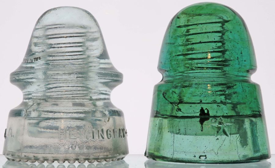 Two styles with a little extra! Actual postage additional: CD 162 HEMINGRAY-19 // MADE IN U.S.A. - RDP -- ice clear with a nice carbon swirl across the dome -- pinkie inner skirt chip on back -- $5 (SOLD) CD 145 star -- nice green with a black glob inclusion near the star -- small ping in the upper wire groove -- $8 (not sold) NOTE: I'm selling these insulators on behalf of the Jim Fielding estate -- PayPal (no fee friends and family) or checks are both accepted - I'll provide instructions. I'll also be handling all the packing and mailing. |