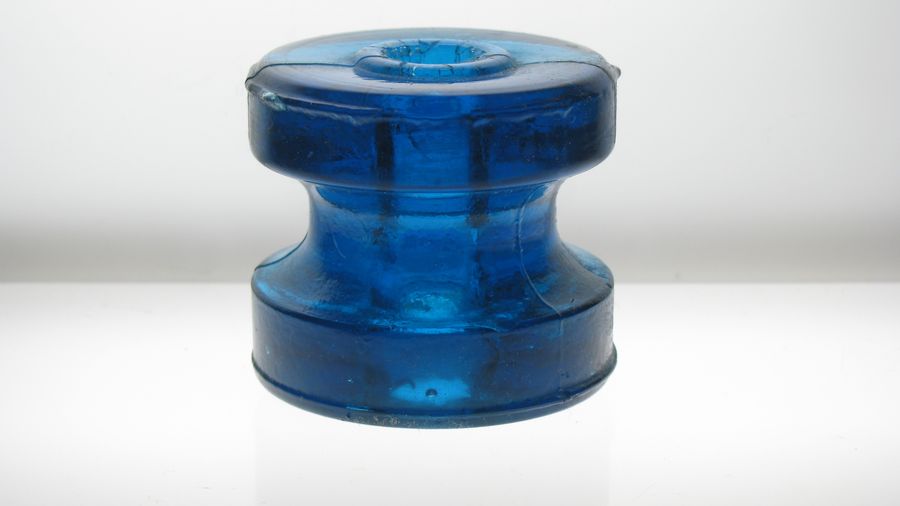 Here's a beautiful Peacock Blue glass spool from Colombia. Made by Zicme. Easily VNM on the exterior including both pinholes! Unfortunately it was split in half and reglued.