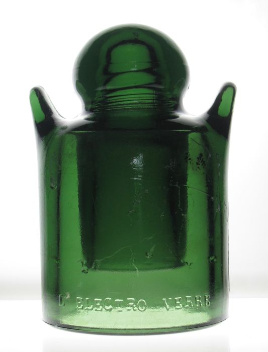 Here's a beautiful Dark Yellow Green CD 642 L'Electro Verre (front) 35/1 (reverse) Gingerbread man insulator from France. Has typical factory rub marks in wire groove channels and some scratches on the skirt (front and back). Small nick on the outside of one arm and on the 'apostrophe mark, small flake and bb ping. First email gets this 5 3/4" tall glass insulator for reduced price of only $38 plus 8.55 shipping. Thanks! |